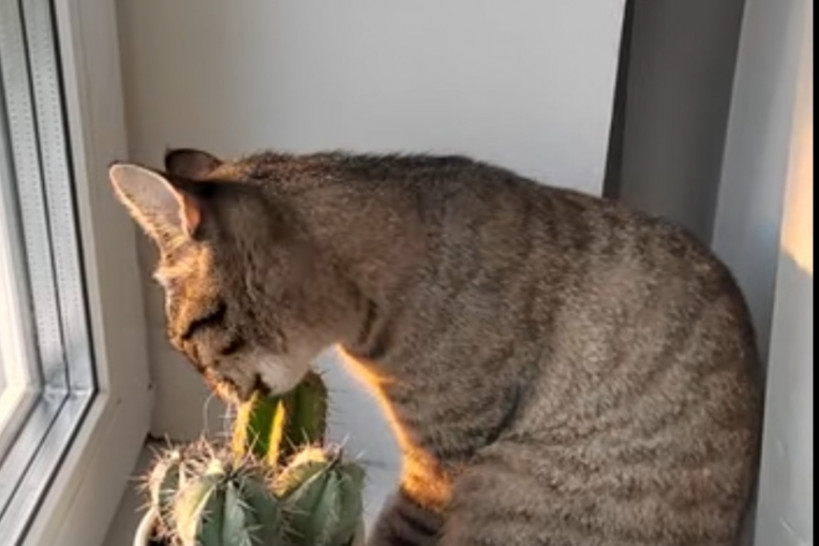 Кошка Буся любит есть цветы и даже кактусы)